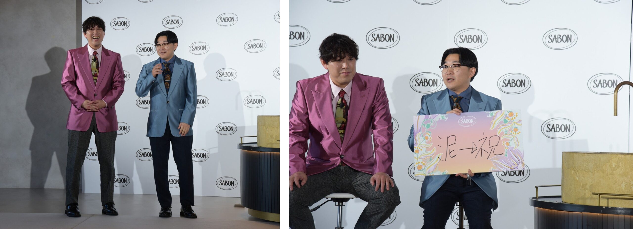体験を終え、心境に大きな変化が見られたお二人は、それまでの黒系ジャケットから、コレクションの世界観をイメージした華やかなジャケットへとその場で着替えを披露。パッと明るく変身した姿に、アン ミカさんも「SABONのスクラブで心の垢も邪気も洗い流して、生まれ変わったね。輝いています!」と絶賛し、会場の雰囲気も一気に華やぎました。