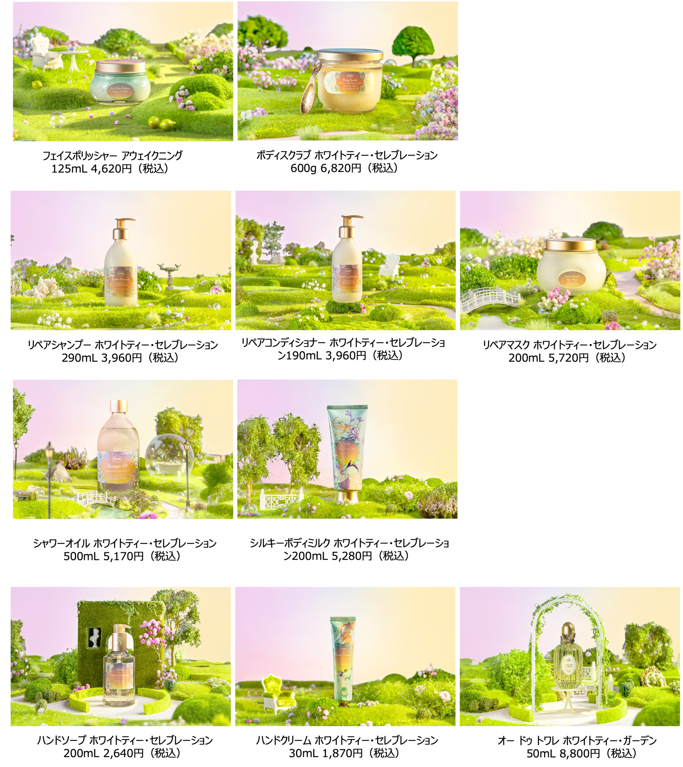 ホワイトティー・セレブレーションは、SABONを代表するアイテムの数々が、華やかな限定パッケージで登場するとともに、通常はホワイトティーの香りでは展開していないアイテムに加え、その香りにインスパイアされた限定アイテムを取り揃えた特別なコレクションです。