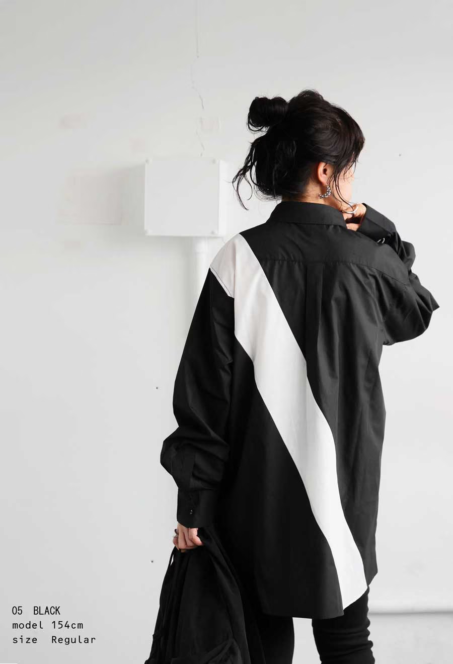 モードな雰囲気を感じさせるバイカラーデザインと、ゆったりとしたシルエットが特徴の一着です。