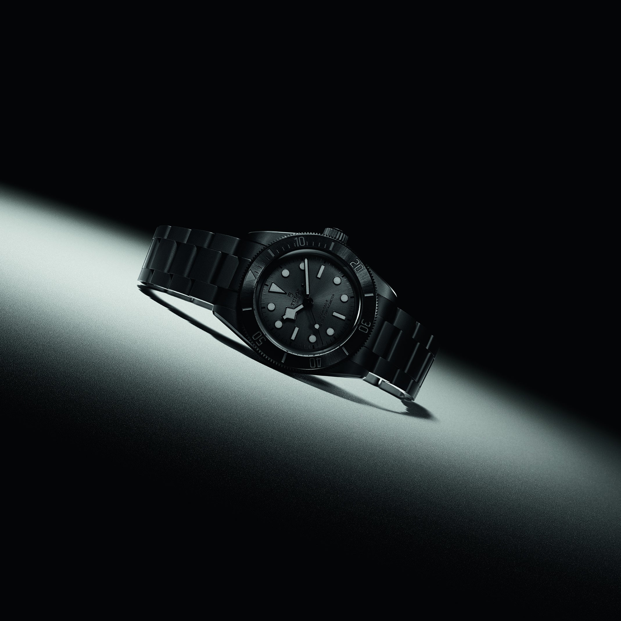 先端技術を彷彿させるコンテンポラリーなディテールと、大胆な漆黒のテーマが融合するブラックベイ セラミックの外観。マットブラックのモノブロックセラミック製ケースの表面はサンドブラスト仕上げ、面取りされた斜面はポリッシュ仕上げとすることで、際立つコントラストと明瞭なラインが生まれている。ブレスレットもフルセラミック製で、軽やかな装着性を実現。回転ベゼルのインサートにも、サンレイサテン仕上げのブラックセラミックを採用。そこに刻まれた同系色の目盛りは光に応じて繊細に変化し、マットな質感を引き立てる。ダイアルはブラック・オン・ブラック(厳密にはブラック×チャコールではあるが)、アプライドアワーマーカーにも「ダーク」蓄光塗料があしらわれている。すなわち、この時計は全身ブラックだ。これは卓越した技術の象徴であり、チューダーは漆黒デザインの中に「ゴーイング・ダーク」の美意識を受け継いでいるのである。