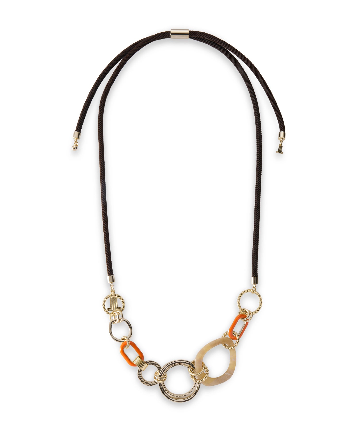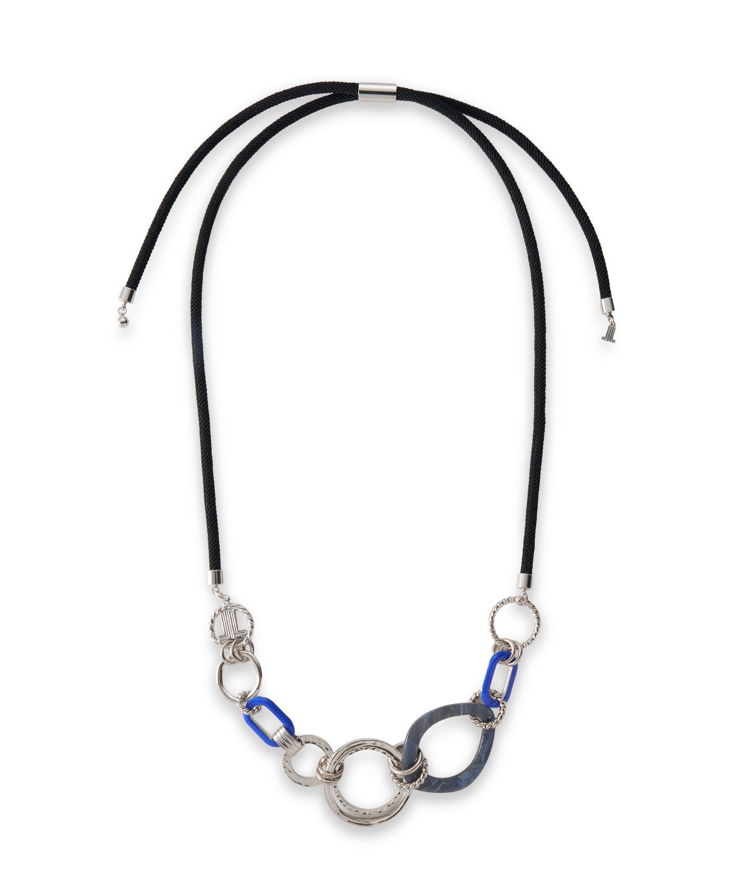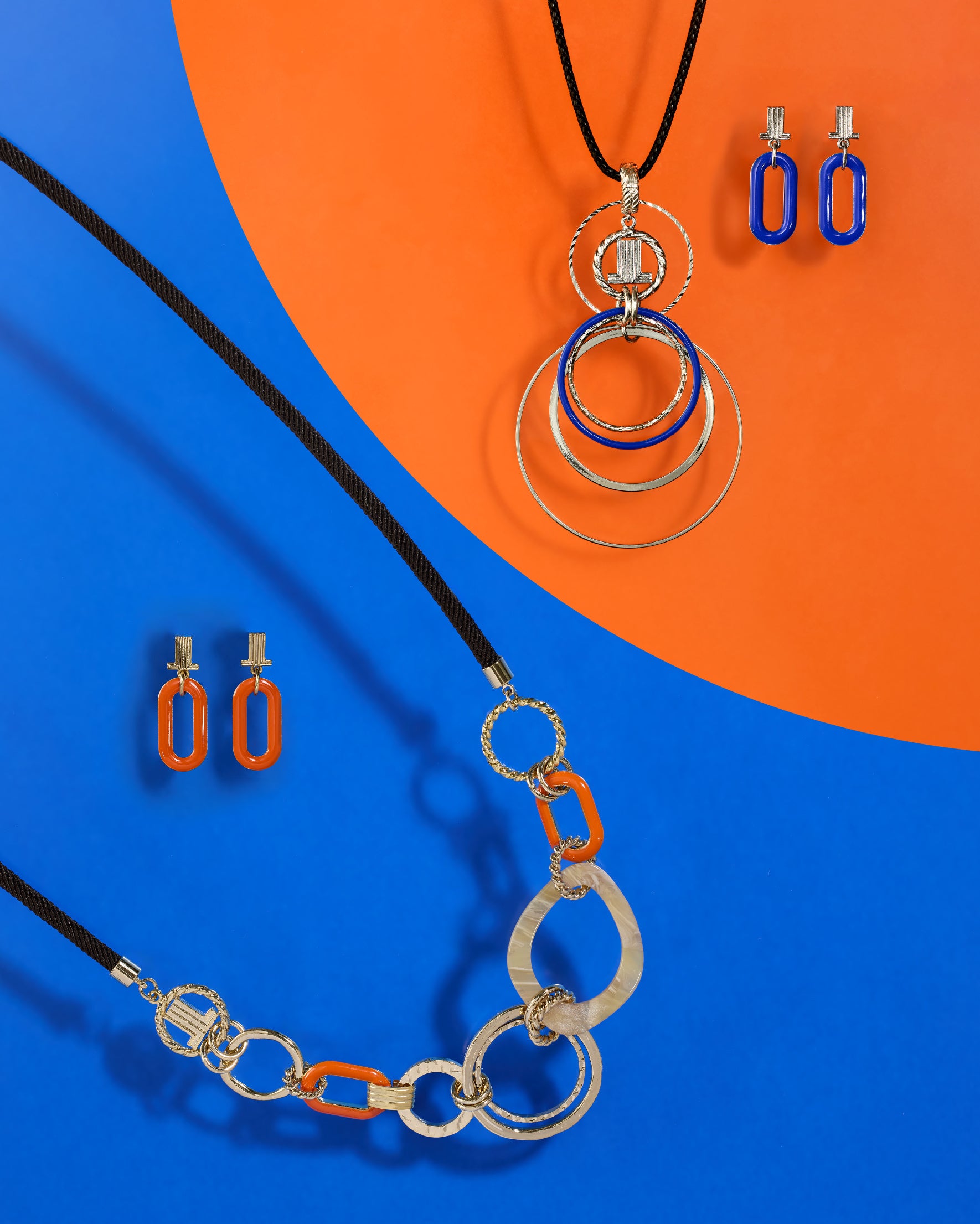 2種類のコードネックレスは、重なり合うサークルパーツが軽やかな印象を生み、ミックス感のあるデザインが遊び心をプラス。オーバルパーツが揺れるピアス(イヤリング)は、両面にカラーを施し、360度どこから見ても美しい仕様。夏の装いに鮮やかなアクセントを添える、オレンジとブルーの2色展開です。