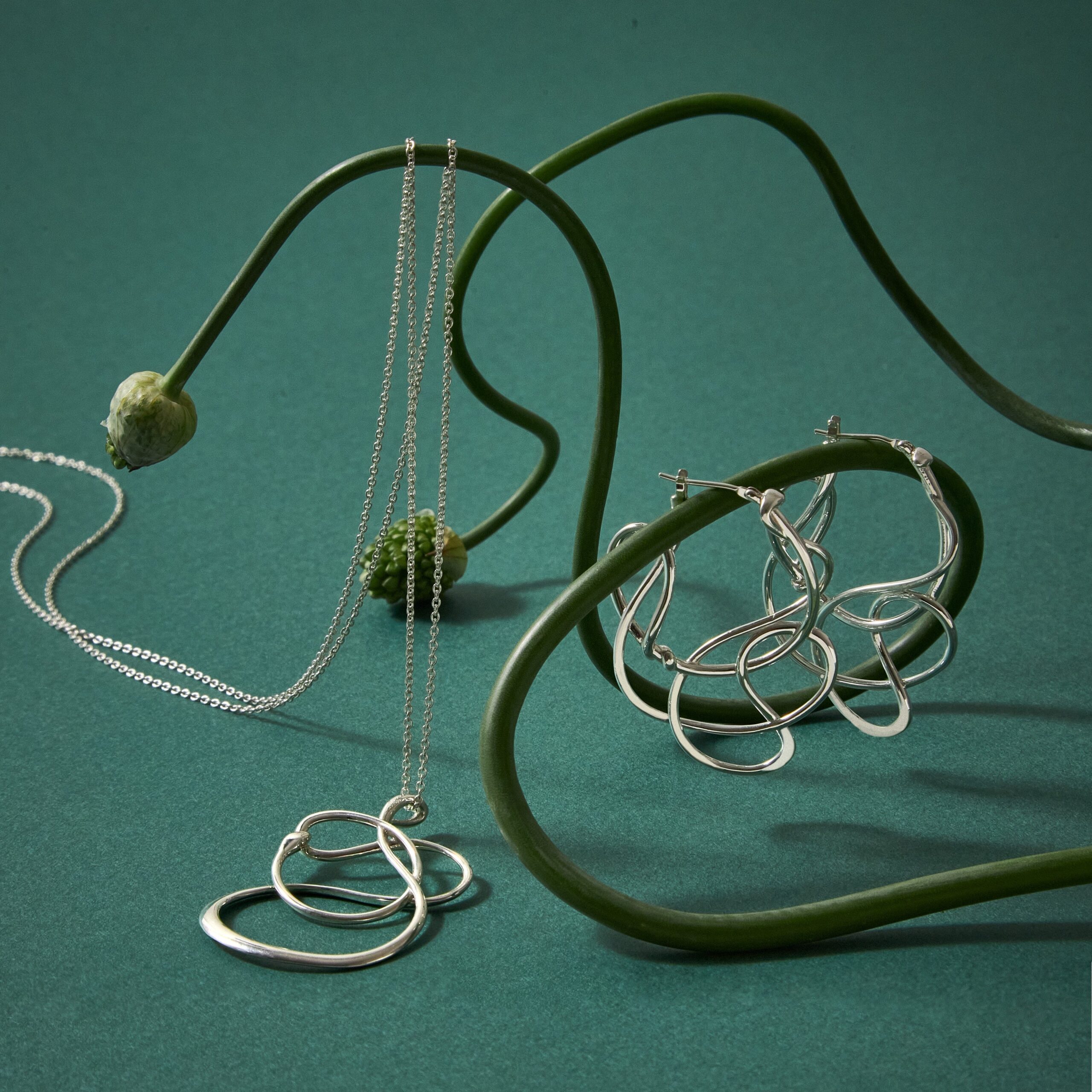 その曲線美に、古来より繁栄と永遠の象徴とされてきた蔦の生命力を重ね、モダンに描き出したネックレスとピアス。