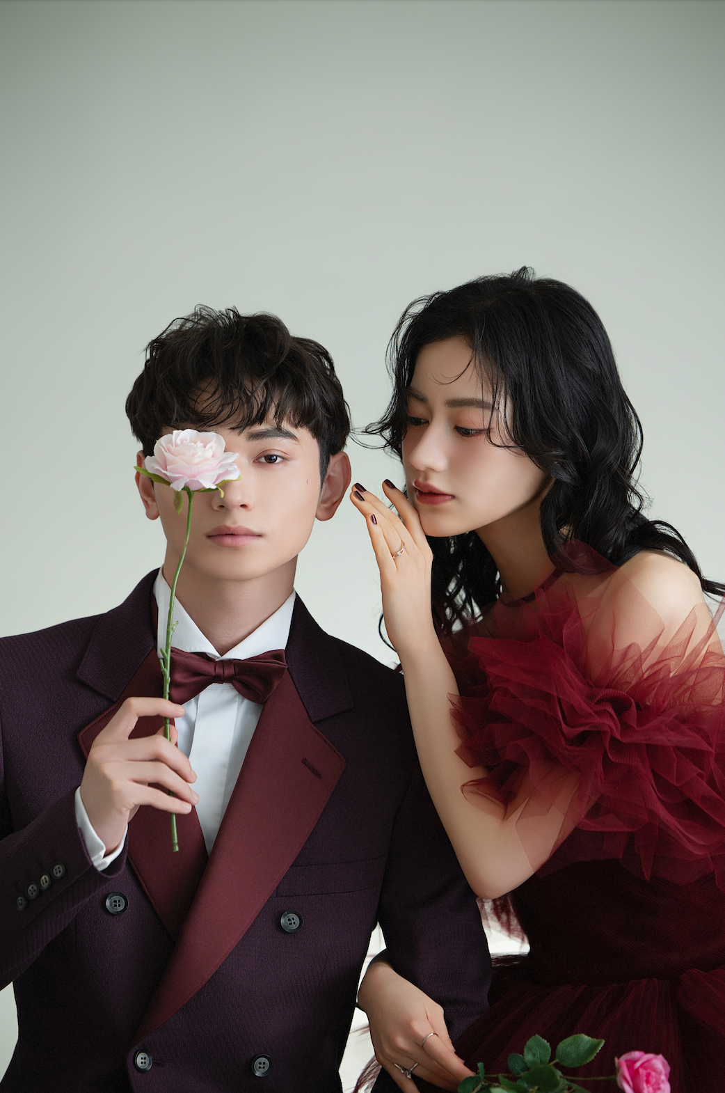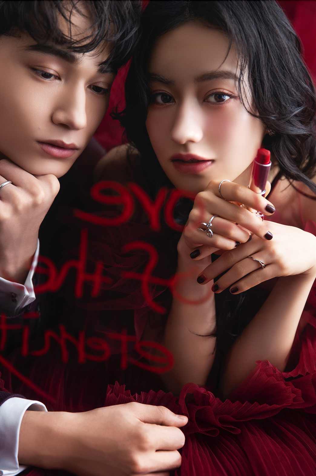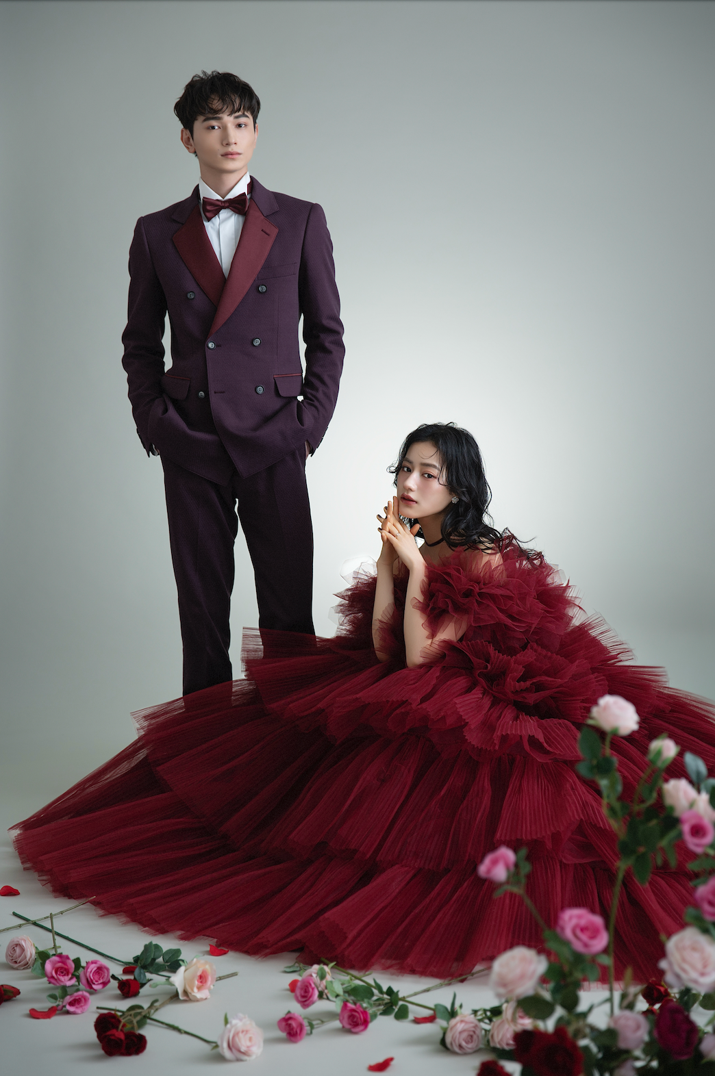深紅ドレスのモードなハイファッション感に、空間とヘアメイクに甘さを足して、レディ感を。