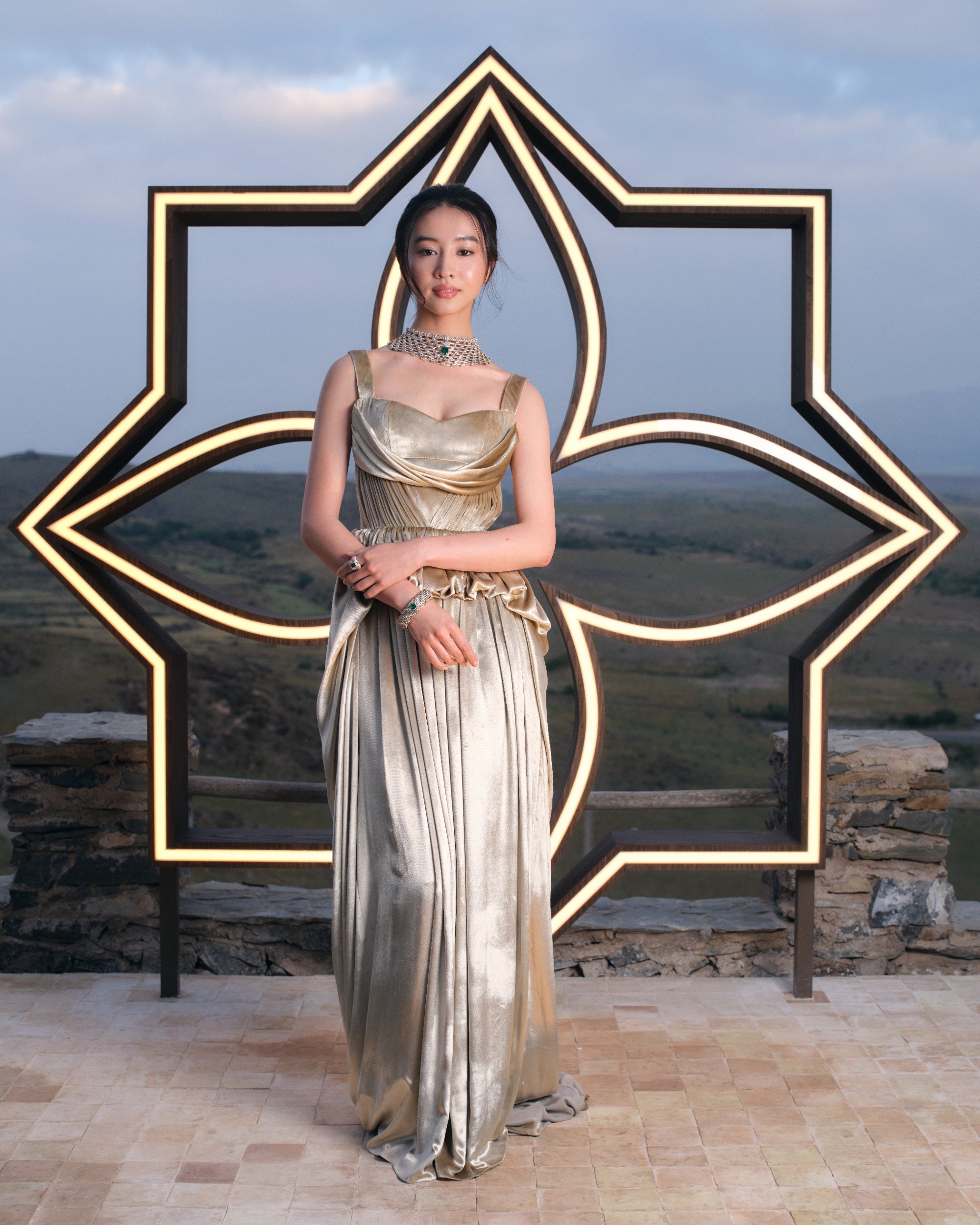 また、メゾンのハイジュエリー·コレクション「Awakened Hands, Awakened Minds(アウェイクンド ハンズ アウェイクンド マインズ)」より、ホワイトゴールドとダイヤモンドをあしらったネックレス「フレカンス」、ホワイトゴールドとダイヤモンドのイヤリング「エレガンス」、そしてホワイトゴールドとダイヤモンドのブレスレット「グラヴィテ」も着用しました。