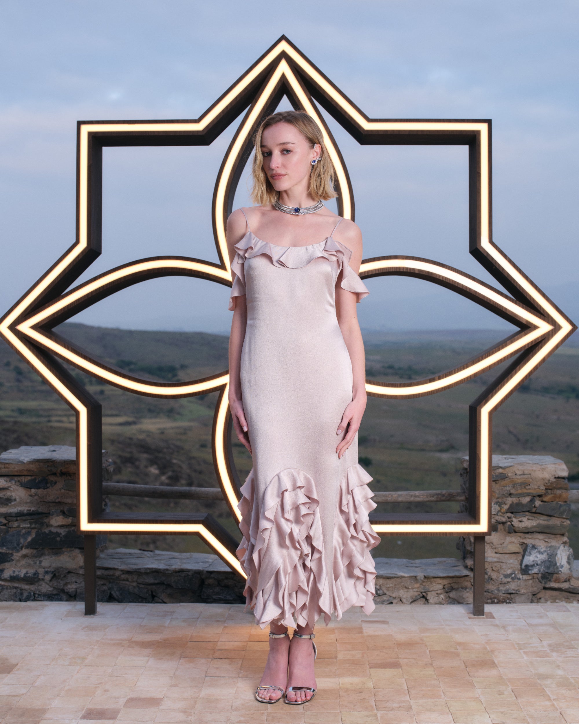 また、メゾンのハイジュエリー·コレクション「Awakened Hands, Awakened Minds(アウェイクンド ハンズ アウェイクンド マインズ)」の「グラヴィテ」より、27.20カラットのカボションカットのサファイアをあしらったネックレスと、2.49カラットのオーバルカットのサファイアをセットしたリング、さらに「モーション」より、4.55カラットと4.64カラットのオーバルステップカットのサファイアを配したイヤーカフも着用しました。